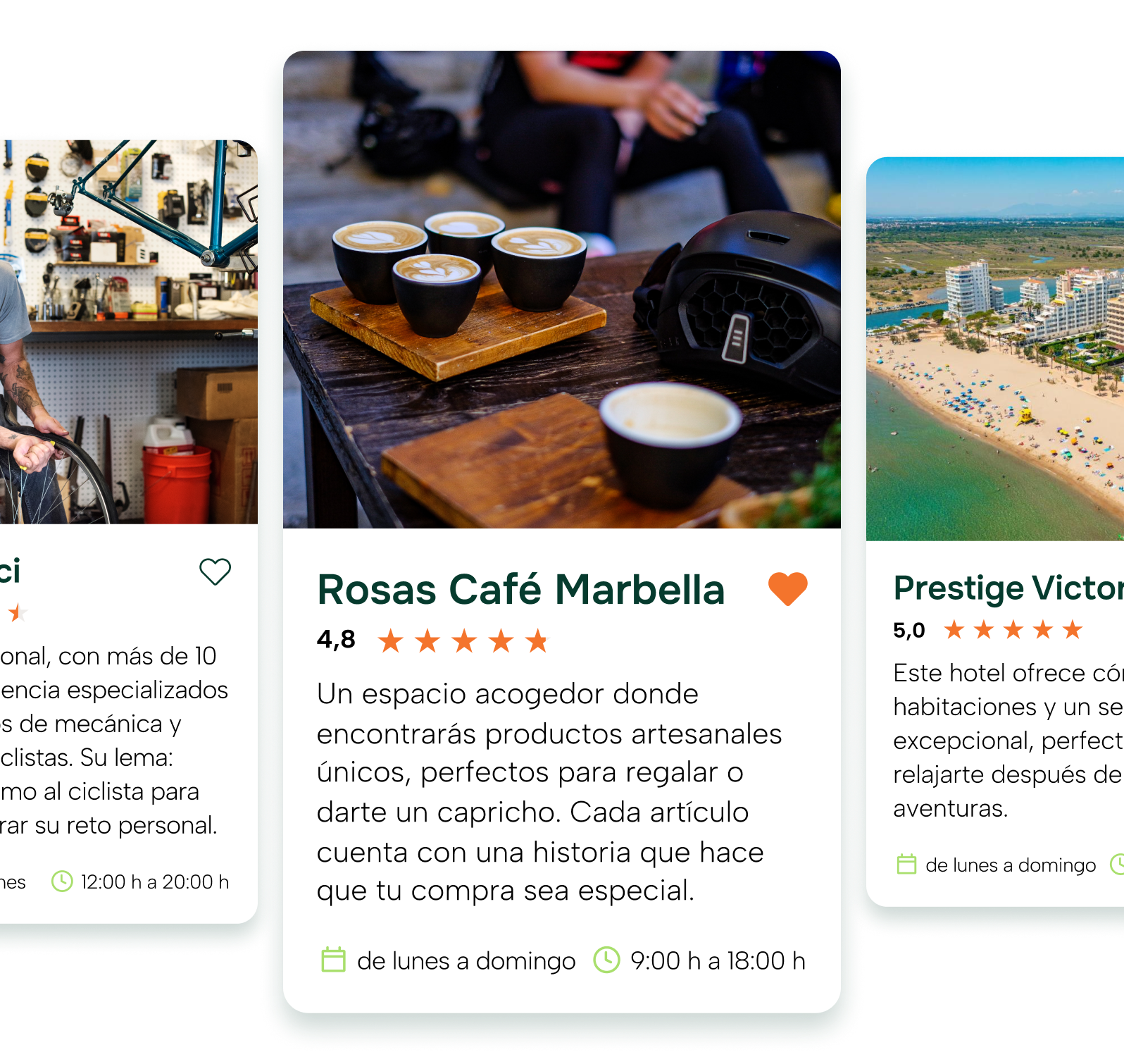 Complementa tu próxima ruta con nuestras recomendaciones. Hemos reunido todos los servicios que puedas necesitar en el camino, para que tú solo tengas que pedalear. Descubre qué opinan los demás usuarios y comparte tu experiencia en cada visita.