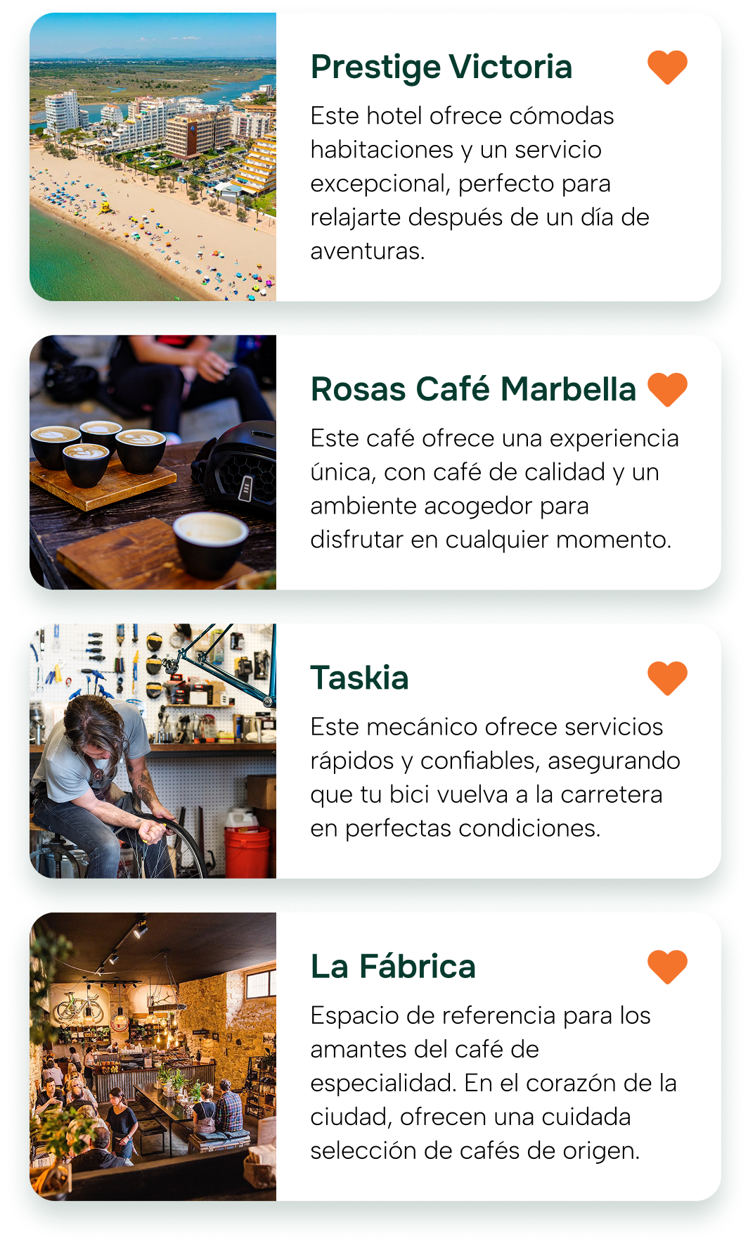 Encuentra todo lo que necesitas para complementar tu próxima aventura: recomendaciones de cafeterías, hoteles, tiendas y servicios locales que visitar a lo largo del recorrido. Así, no solo disfrutas de una salida más cómoda, sino que también contribuyes al impulso del comercio local.